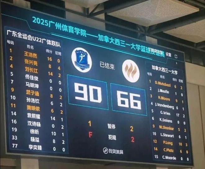 广东全运会U22男篮一直在为全运会备战,前一段时间一直在主教练郑永刚的带领下在长沙集训,并和湖南师范大学男篮打了一场热身赛,结果是以85-60大胜了对手。结束了长沙的集训后,广东全运会U22男篮回到了广州体育学院,并和加拿大西三一大学校队打了场友谊赛。通过比赛来看,加拿大这支球队的实力并不算强,广东全运会U22男篮的优势比较明显,最终是以90-66的比分大胜了对手。