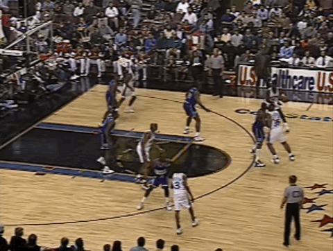 半场结束时,76人落后雄鹿7分。易边再战,艾弗森看上去逐渐适应了比赛节奏,他在阵地战中愈发活跃:先是通过手递手飙进三分,那个赛季他很快成为联盟排名前列的三分手;随后,随后又两次在底线区域觅得机会,一次补篮、一次空切,展现出敏锐的无球嗅觉。