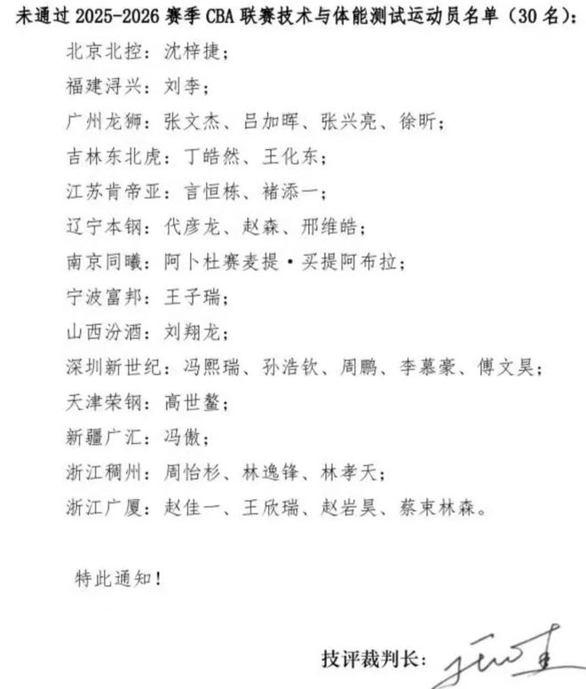 目前,20支球队的球员已经完成了体测,结果,有30名球员没有通过本次体测,接下来,他们将会进入补测。假如,补测不通过,那么,将会错过CBA常规赛前十五轮的比赛。