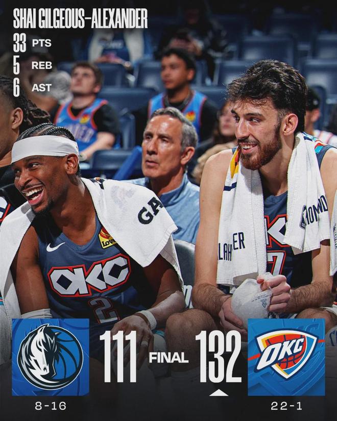 此役过后,雷霆22胜1负继续排名联盟第一,活塞18胜5负排名联盟第二。雷霆领先活塞4个胜场,领先西部第二的火箭5.5个胜场。亚历山大出战28分33秒,投篮12中10,三分2中2,罚球12中11,狂砍33分5板6助,正负值+24!