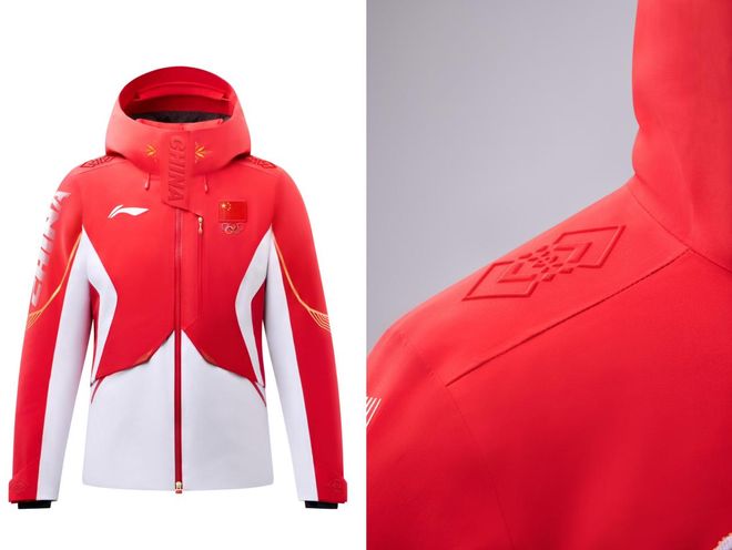 夜幕的聚光灯下,随着“三、二、一”倒计时,现场所有镜头,都对准了巨幕电子屏里出现的一件红白相间的领奖服。衣服的正面上半部分用红色勾勒着象征五角星的线条;而下半部分和袖臂的白色,就像是白雪皑皑的高山与蜿蜒的雪道;从衣服侧面看,能隐约看出李宁品牌LOGO的标识形象;背面CHINA的字母纹饰,在夜晚的光照后更加清晰。