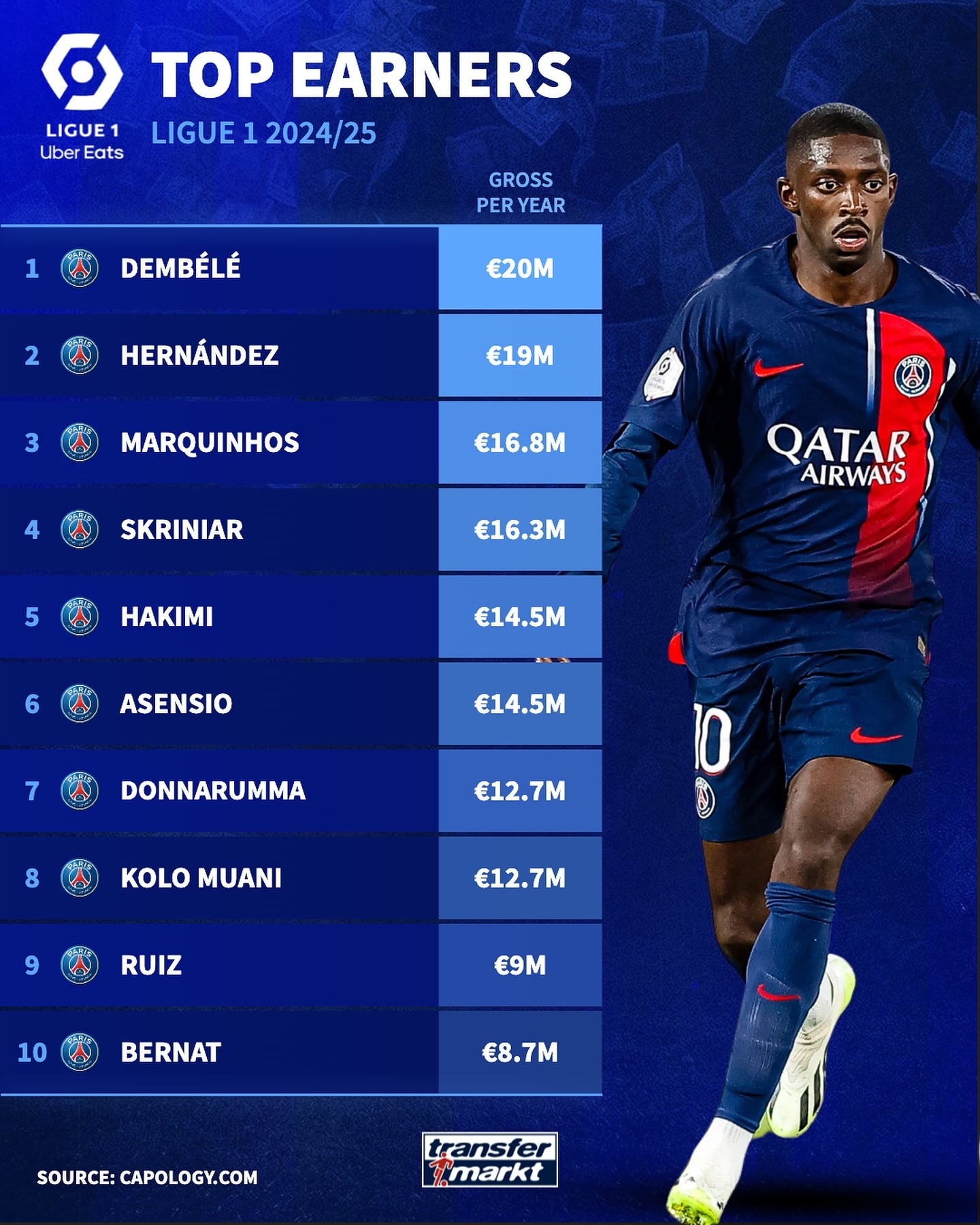都是巴黎的!法甲球员年薪前十:登贝莱2000万欧领跑卢卡斯第二
