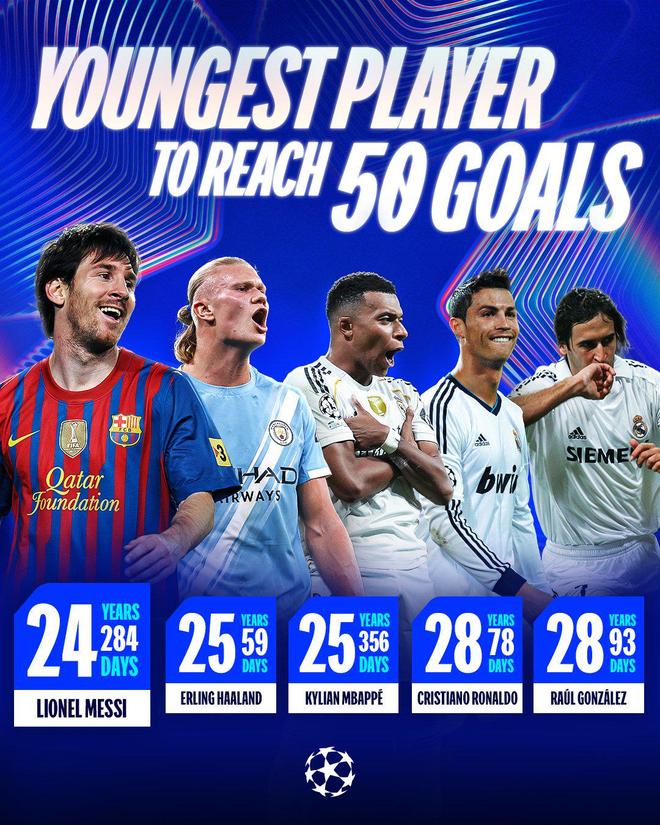 欧冠最年轻50球排名:梅西居首,哈兰德姆巴佩分列二三