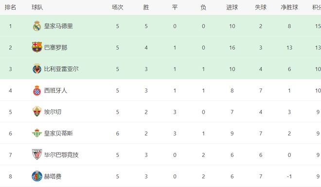 在积分榜上,5战全胜的皇马以15分排名榜首。巴萨紧追皇马,4胜1平拿到13分排名第2。第3的是比利亚雷亚尔,拿到了10分。西班牙人也是10分排名第4。第5的是埃尔切,拿到9分。皇家贝蒂斯、毕尔巴鄂竞技和赫塔费也都是9个积分。至于马竞,战绩是1胜3平1负,只拿到6分,排名掉到第12。
