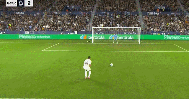 第63分钟,居莱尔直传策动反击,姆巴佩禁区内急停变向,被埃尔格萨瓦尔放倒,裁判判罚点球。第64分钟,姆巴佩亲自操刀,勺子点球命中,皇马再度扩大战果,3-1!