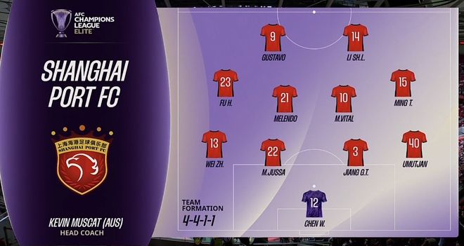 上海海港首发:陈威、蒋光太、魏震、明天、傅欢、吾米提江·玉苏普、马特乌斯·维塔尔、梅伦多、马修斯·茹萨、古斯塔沃、李圣龙