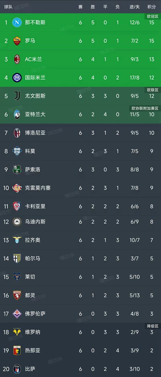 随着那不勒斯21逆转,尤文00闷平,意甲第6轮最新积分榜如下!