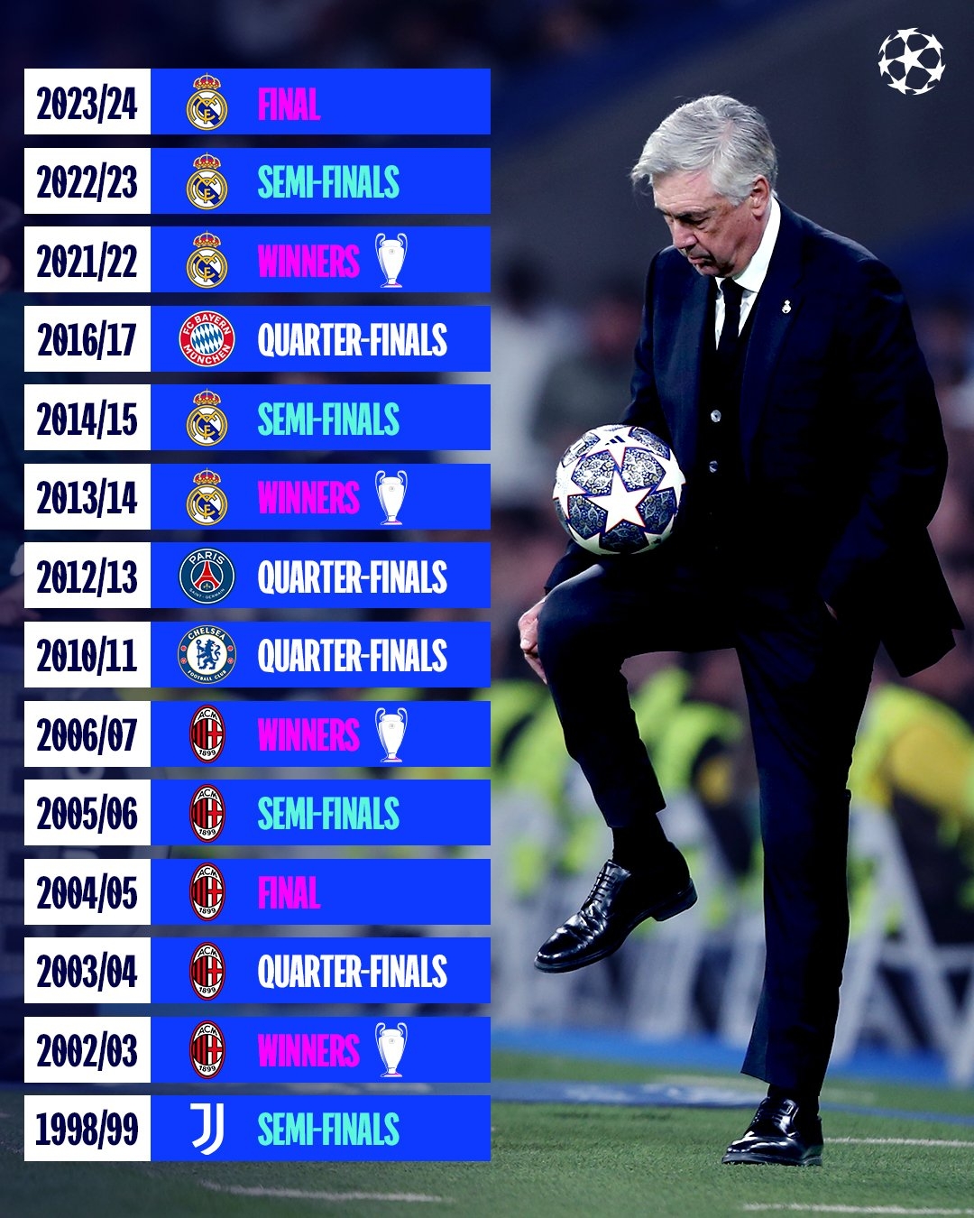 安切洛蒂欧冠执教表现:6进决赛已夺4冠米兰2冠&皇马冲击第3冠
