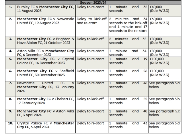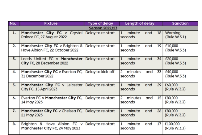 在英超官方公布的文件中,曼城有22次延迟开球违规行为,被罚209万镑。22-23赛季有8次,23-24赛季有14次。
