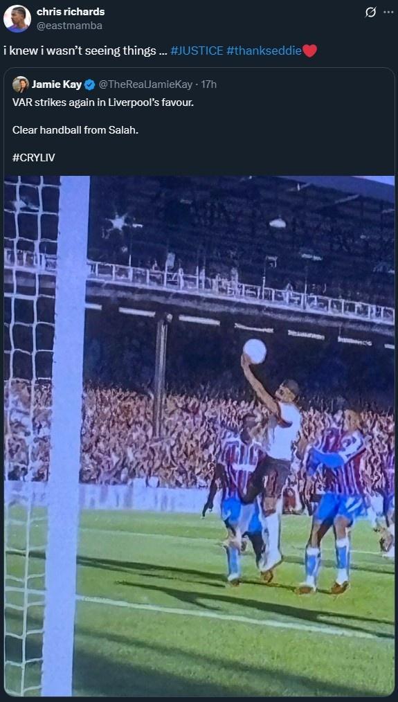 水晶宫后卫理查兹转发萨拉赫手球照片:我就知道这不是我的幻觉