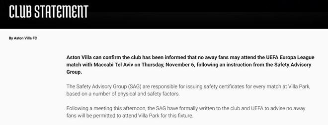 10月16日,阿斯顿维拉俱乐部官方宣布,11月6日欧联杯联赛阶段第四轮主场对阵以色列特拉维夫马卡比一战,将不允许客队球迷入场。阿斯顿维拉在声明中表示,这一禁令由负责主场维拉公园球场赛事安全许可的“安全咨询小组(SAG)”决定。