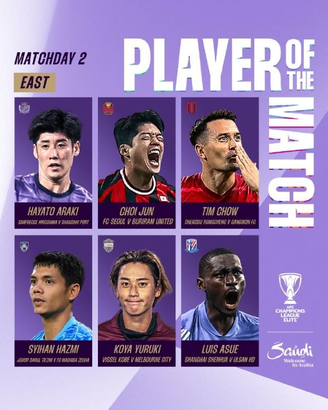 亚足联官方公布亚冠精英联赛第2比赛日的最佳球员。周定洋凭借成都蓉城比赛中一粒至关重要的进球入选;上海申花外援阿苏埃建功入选。