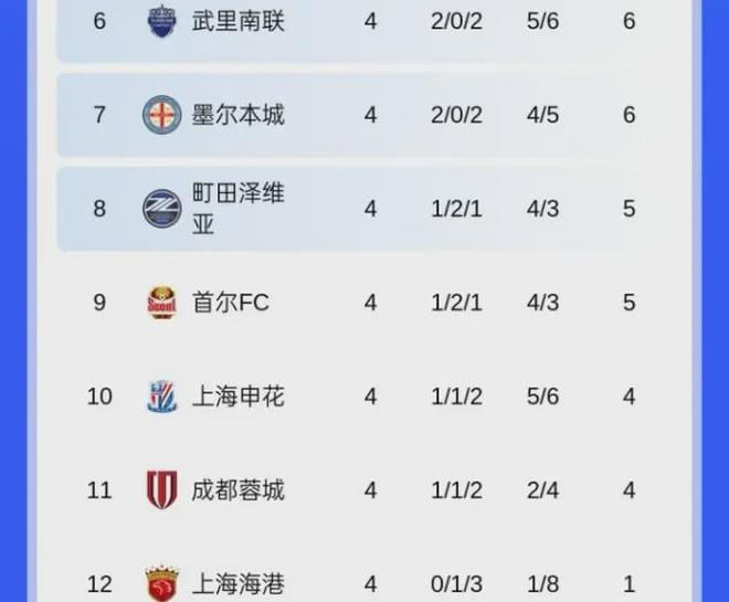 本轮亚冠东亚区战罢,中超球队交出耻辱答卷:海港0-2武里南联,蓉城0-0首尔FC,申花1-3柔佛新山。积分榜上,海港4轮1分垫底,蓉城、申花分居倒数二三,三支球队加起来仅积9分,神户胜利船一支球队就拿到了这个分数。